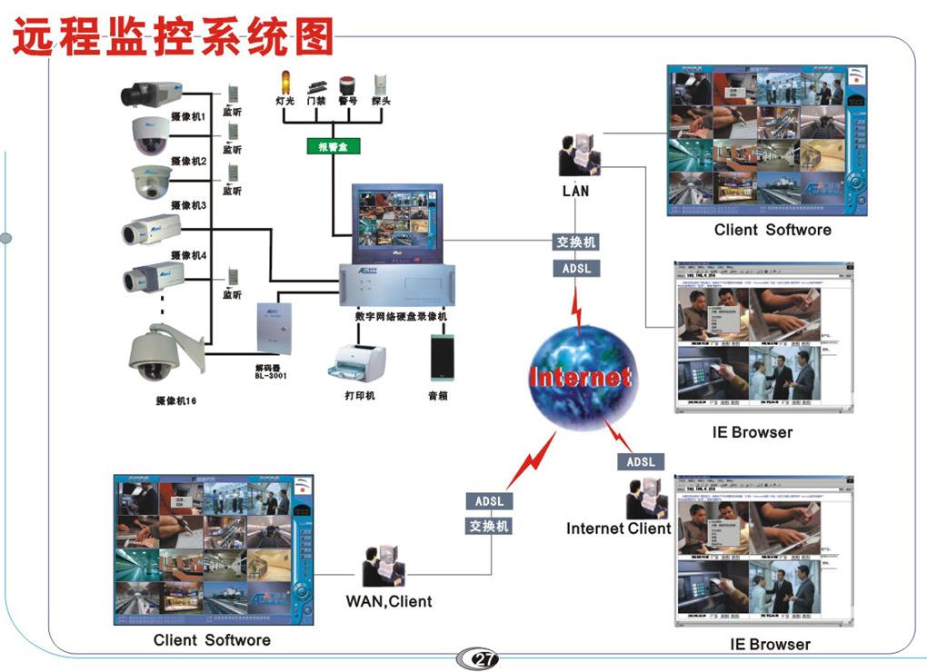 在信息中心或機房,設置監控中心,選擇配置較高的PC作為監控主機,安裝DSS監控軟件系統,管理人員通過DSS監控軟件,進行全面的監控管理,管理人員在監控中心或在各自的辦公室,通過計算機網絡,用計算機監控各場景,使用監督管理。